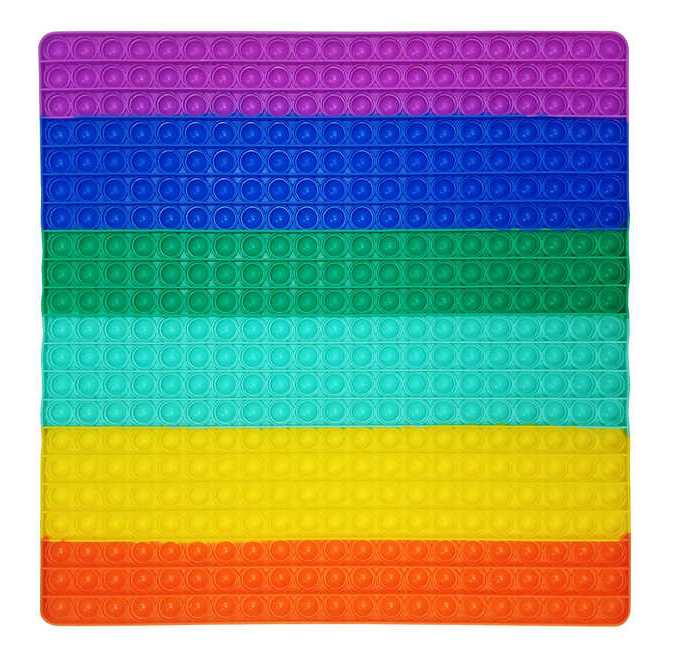 Our largest Push Popper mat yet! This 40cm rainbow coloured pad is covered in bubbles that make a satisfying pop sound when pushed inwards, similar to bubble wrap. After one press, the bubble then appears on the other side, ready to be pushed and popped all over again. This fiddle toy is immensely satisfying to use, and is proving to be a big hit with popular Tik Tok users and other social media influencers. Extra-large plastic pad with popping bubbles Trending fiddle toy Huge with social media influencers worldwide Behaves like reusable bubble wrap Push bubble to hear pop sound Rainbow design 40cm