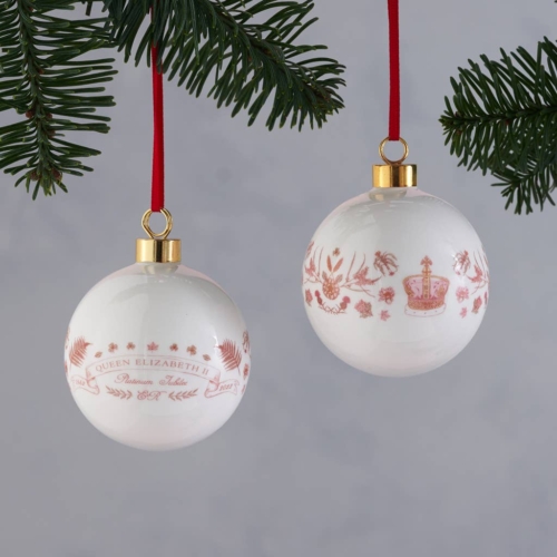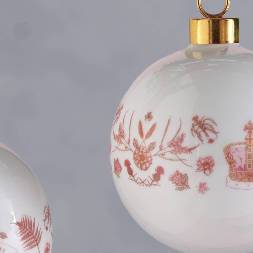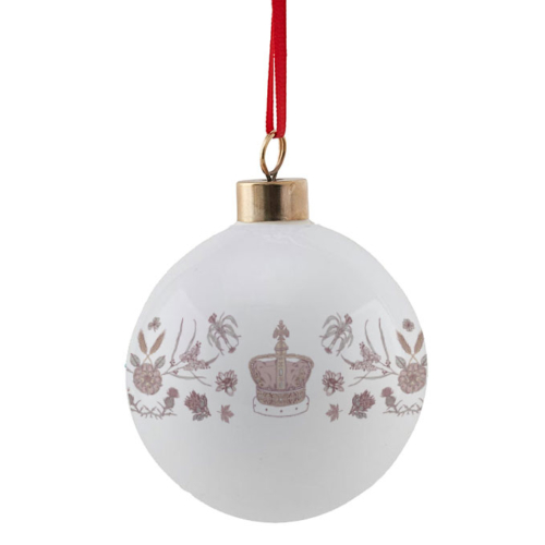 The Queen’s Platinum Jubilee collection celebrates 70 years since HRH Queen Elizabeth the Second’s Ascension. The intricately hand-drawn design was inspired by the magnificent dress worn by The Queen during her Coronation in 1953 featuring embroidered flowers from across the Commonwealth including the Tudor rose (England), thistle (Scotland), leek (Wales), shamrock (Ireland), wattle (Australia), maple leaf (Canada), fern (New Zealand), protea (South Africa), lotus flowers (India and Ceylon) and wheat, cotton, and jute (Pakistan).Using traditional craftsmanship up to 20 pairs of hands can be involved in making each bauble. This includes applying the intricate design skilfully by hand.- Hand-crafted using Cornish Clay in Stoke-on-Trent, Staffordshire, UK, the heart of the ‘Potteries’.- Made by Duchess China 1888, exclusively for Victoria Eggs.- Dimensions: 60mm / 2.4″ diameter.Presentation boxes for baubles are available separately.