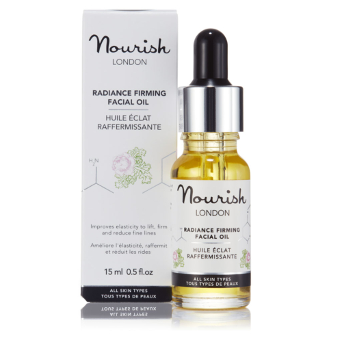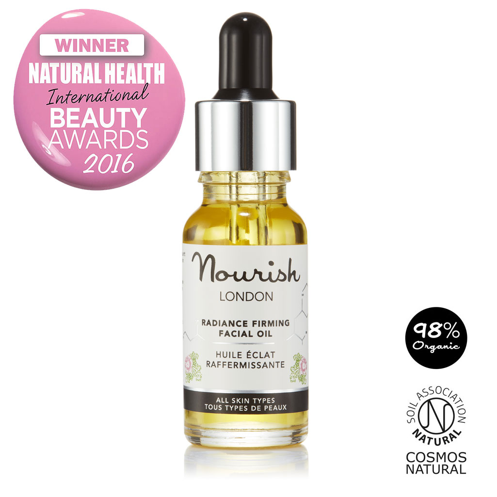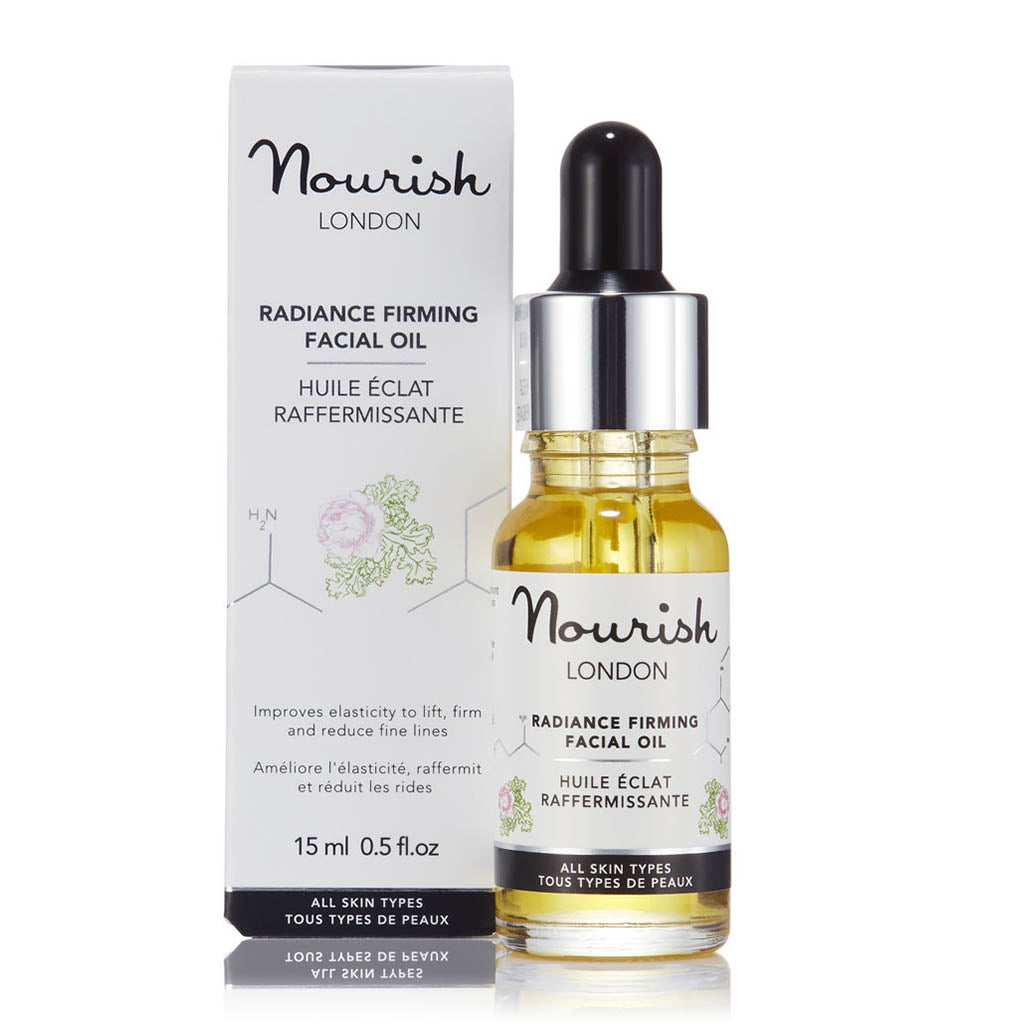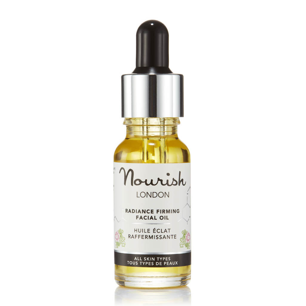 Description Our anti-ageing face oil features a heavenly combination of natural omega-rich oils to lift, firm and hydrate the skin. Improves elasticity and reduces fine lines and wrinkles. Leaves skin radiant. Radiance Firming Facial Oil may look like a simple oil, but this scientifically developed blend combines omega-rich organic oils and phytonutrients to improve elasticity, lifting, firming and hydrating the skin while reducing the appearance of fine lines and wrinkles. Skin feels silky-soft, smooth and glowing with radiance. Quickly absorbed and non-greasy. Including toning and protecting zinc-rich pumpkin seed oil, line-minimising macadamia nut oil and phytonutrient-rich marine algae, our hydrating face oil strengthens elastin and boosts collagen production for a smoother, more radiant complexion. A must for all skin types. 98% organic – Certified Cosmos Natural Awards: Winner as Best Facial Oil – Natural Health Magazine International Beauty Awards 2016 Nourish London skincare formulations are 100% vegan, made with natural organic ingredients, alcohol (ethanol) free & cruelty-free.