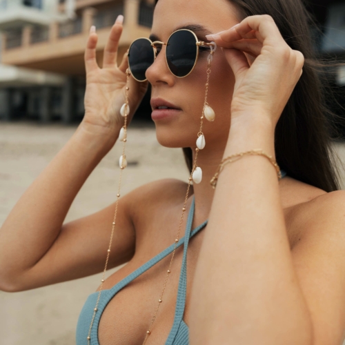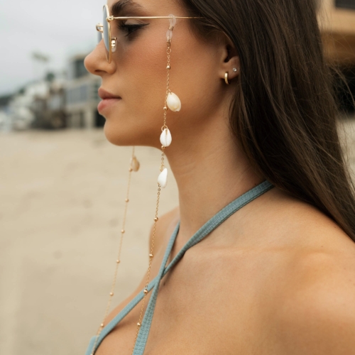 A stunning accessory that effortlessly combines functionality with a touch of fun. Add that finishing touch to your outfit of the day with this gold beaded shell chain! Add the Rae to your favorite pair of sunglasses. Sunglasses not included
