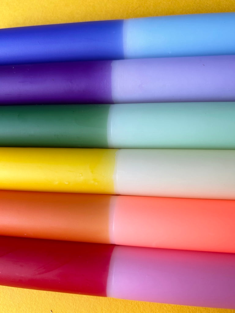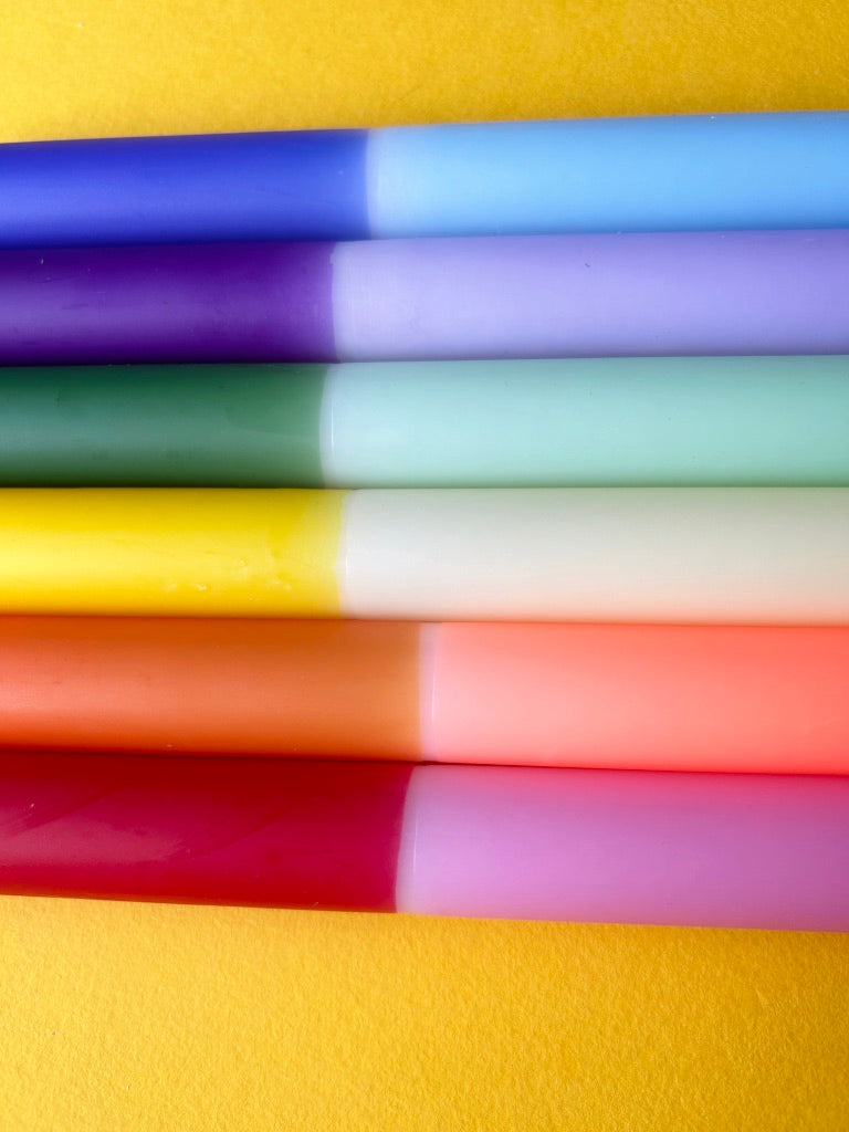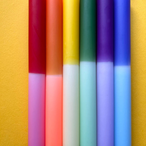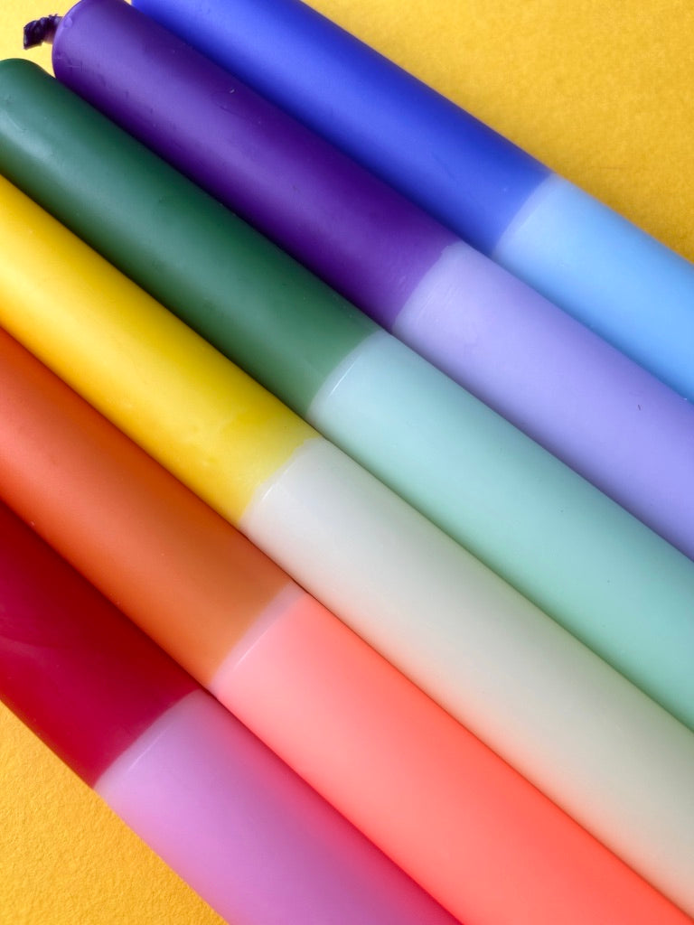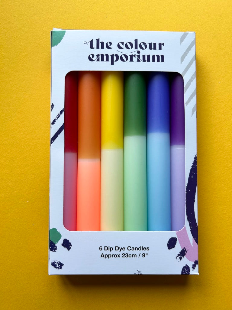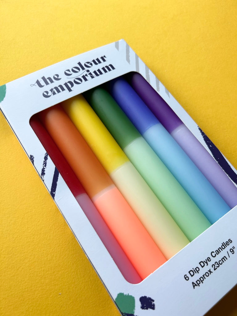 The Colour Emporium presents this rainbow dip dye set of 6 to celebrate both Pride and honour our NHS These candles make the perfect gift for a stylish host, and come beautifully wrapped for the purpose. Each of the candles is hand dipped in the Surrey Hills and every set is unique – the bright colour combination is always the same but the pattern will vary slightly. Hop on the colourful candle trend and add some joy and atmosphere to your home. The candles measure 23cm x 2.3cm and have a tapered end to fit standard candle holders. Made from paraffin wax. Burning time: 9 hours.