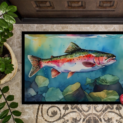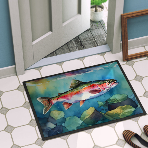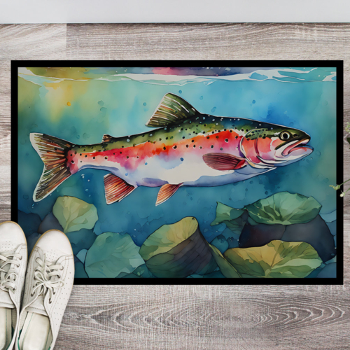 Doormat featuring breed specific Rainbow Trout artwork. Welcome your guests in style with our Artwork Door Mat, designed to withstand almost any weather condition. This mat, measuring approximately 24 by 36 inches, is held together by durable black binding tape. Its top layer, composed of polyester felt, is dyed with the eye-catching image you see on the mat. A few layers below provide the mat with stability, while its rubber bottom is stamped to help prevent slipping and ensures safety. Our mat works wonderfully as both an indoor or outdoor door mat. For cleaning, simply hose it off with water or use a power washer – no need for any cleaner that produces suds. Avoid scrubbing with a brush, instead, opt for the vacuum on floor setting. Designed manufactured and printed in the USA, this mat is a perfect addition to your porch, outdoor kitchen, entryway, or any indoor space. Its unique design makes it a charming decorative rug that greets your guests and adds a stylish touch to your home decor.