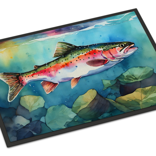 Doormat featuring breed specific Rainbow Trout artwork. Welcome your guests in style with our Artwork Door Mat, designed to withstand almost any weather condition. This mat, measuring approximately 24 by 36 inches, is held together by durable black binding tape. Its top layer, composed of polyester felt, is dyed with the eye-catching image you see on the mat. A few layers below provide the mat with stability, while its rubber bottom is stamped to help prevent slipping and ensures safety. Our mat works wonderfully as both an indoor or outdoor door mat. For cleaning, simply hose it off with water or use a power washer – no need for any cleaner that produces suds. Avoid scrubbing with a brush, instead, opt for the vacuum on floor setting. Designed manufactured and printed in the USA, this mat is a perfect addition to your porch, outdoor kitchen, entryway, or any indoor space. Its unique design makes it a charming decorative rug that greets your guests and adds a stylish touch to your home decor.