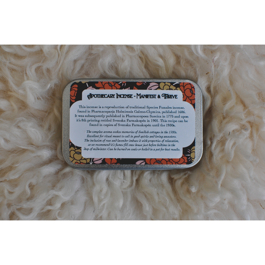 This incense is a reproduction of traditional species fumbles incense, found in pharmacopeia holiness galeno-chemical, published 1686. It was subsequently published in pharmacopeias suecica in 1775 and upon its 8th printing retitled Svenska farmakopén in 1901. This recipe can be found in copies of Svenska farmakopén until the 1930s.