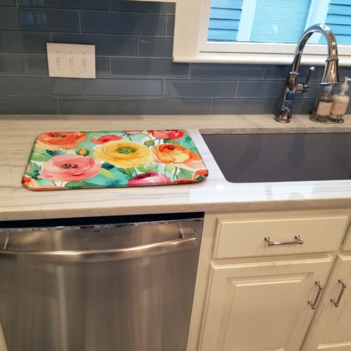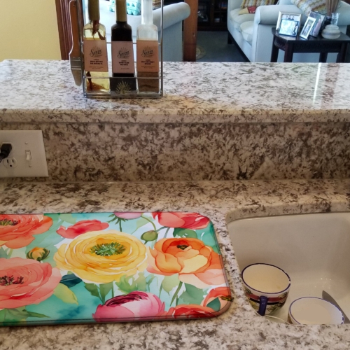Dish Drying Mat featuring breed specific Ranunculus artwork. Say goodbye to messy countertops and soggy dish towels with our innovative dish drying mat. Our high-quality dish drying pad is designed to keep your countertops dry while offering a stylish and efficient solution. Whether you’re air drying dishes, glasses, stemware, silverware, pots, pans, bottles, or even fruits and vegetables, our dish mat is the perfect choice. The 14 inches x 22 inches size fits most counters and dish drying racks, and the non-slip design ensures stability. Made with water-absorbent polyester and a polyurethane foam insert, our dish drying mat is not only functional but also durable. It’s machine washable and printed in the USA for long-lasting use. The beautiful artwork adds flair to your kitchen decor, making it a perfect housewarming gift or present for any occasion. Upgrade your kitchen experience with our absorbent and versatile dish drying mat.