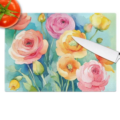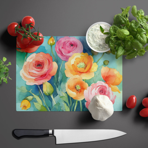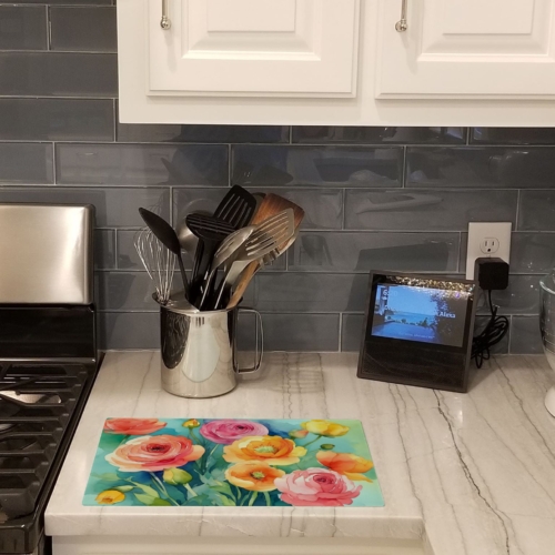 Glass Cutting Board featuring breed specific Ranunculus artwork. Introduce your kitchen to the vibrant, large Decorative Glass Cutting Board from Caroline’s Treasures. Crafted from resilient tempered glass, this board is not only a utilitarian necessity but also a colorful art piece. With its generous dimensions of 15 inches in height and 12 inches in length, it offers ample space for all your cutting needs. Every piece showcases captivating artwork from distinguished artists, bringing an aesthetic edge to your kitchen. Beyond its attractive design, this cutting board ensures your countertop stays pristine and unscathed, owing to its heat-resistant properties. Engineered with user convenience in mind, it features non-skid feet for stability, and rounded corners for additional safety. Its robust construction renders it virtually unbreakable, guaranteeing longevity. The board comes with protective feet bumpers, maintaining its position during use. This product is recommended to be hand washed only. Proudly printed and assembled in the United States, this cutting board exemplifies superior craftsmanship. With Caroline’s Treasures’ Decorative Glass Cutting Board, you’re investing in a blend of functionality and artistic flair.