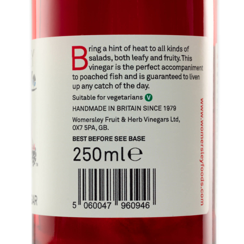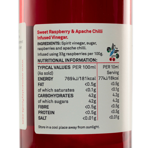 INGREDIENTS: Spirit Vinegar, Sugar, Raspberries (33%), Apache Chilli. Infused using 33g raspberries per 100g.