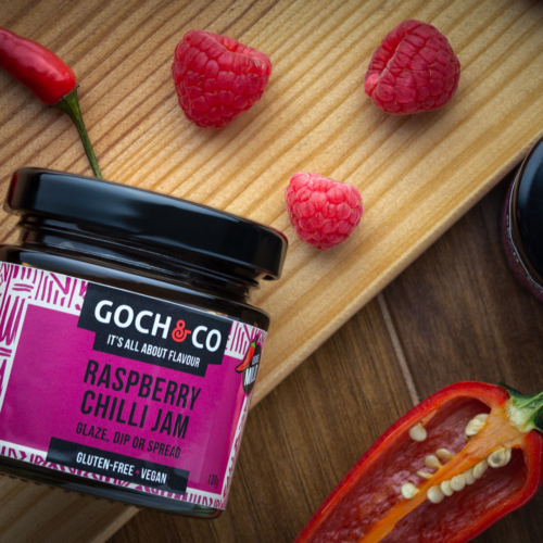 Raspberry Chilli Jam A mild and tasty chilli jam, bursting with flavour and berry overtones. Delicious in tea, on ice cream, hot buttered toast, scones, custard, cheesecake, and rice pudding. Simply add flavour to cheese boards and use as a glaze on poultry dishes and roasts, pâté, and terrines. You can use it to flavour yogurt, desserts, cakes, and smoothies. Gluten-free. No GM. No GMS. Vegetarian. Vegan. No Artificial Additives. Recyclable pack. Made in Wales, UK. Heat Level: Mild Servings per 100g: 20 Each Serving: 5g Ingredients: Raspberries (54%), Chilli Peppers, Sugar. Allergen Advice: For Allergens, including cereals containing gluten, see ingredients in BOLD. Produced in a facility that handles cereals and nuts. Nutrition: Typical Values 100g contains: Energy 810Kj/191Kcal Fat 0g of which Saturates 0g Carbohydrates 46g of which Sugars 46g Fibre 0.8g Protein 0.8g Salt 0g Country of origin: Wales, United Kingdom. Storage: Store in a cool and dry place.