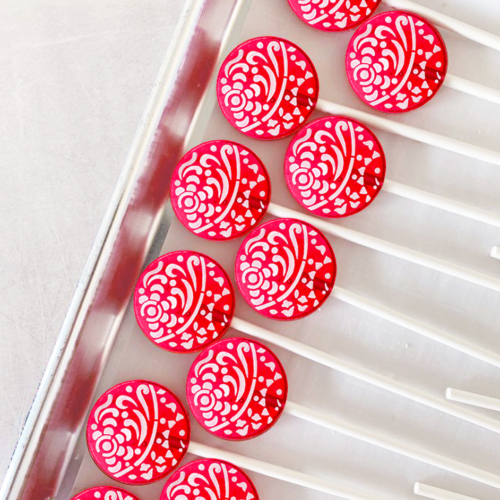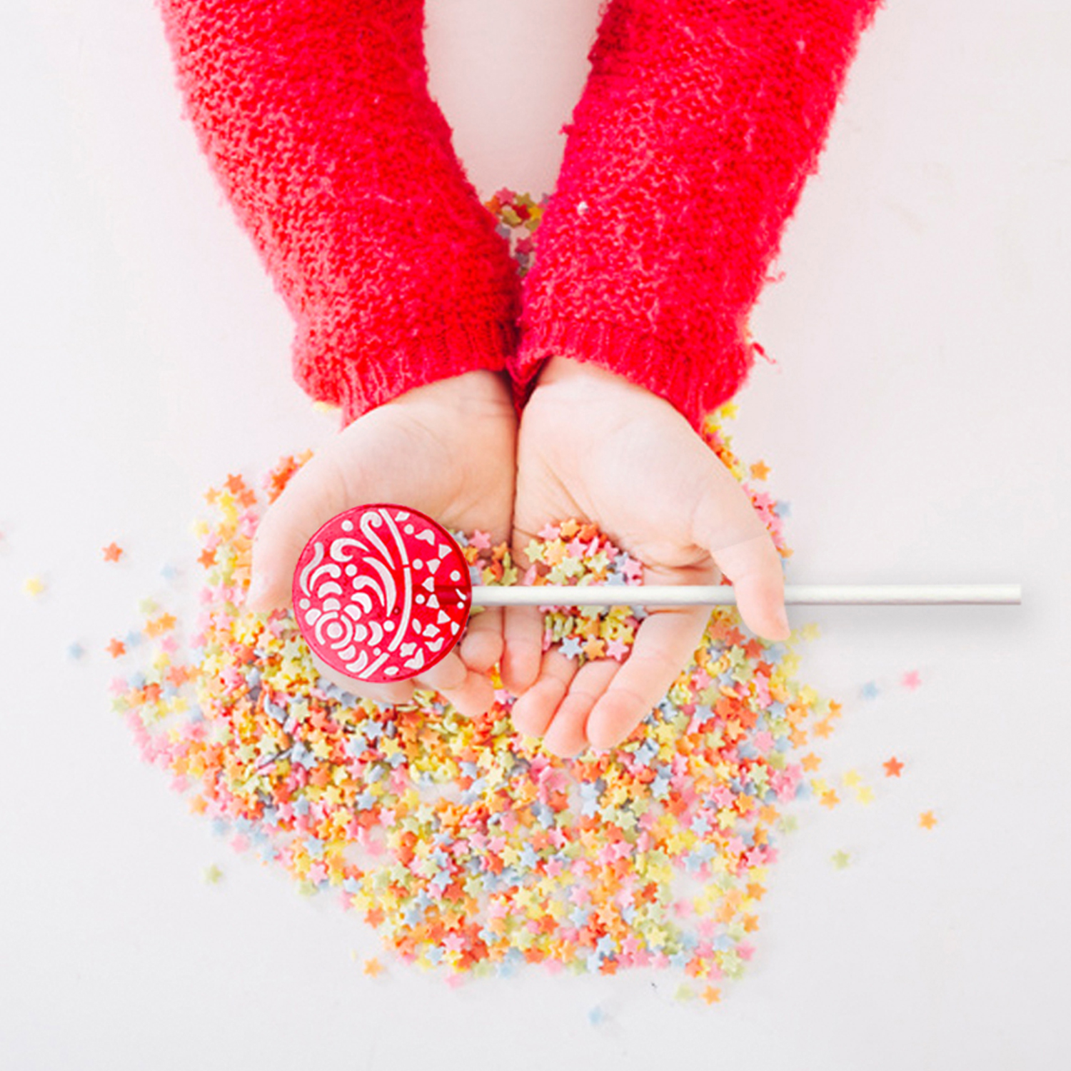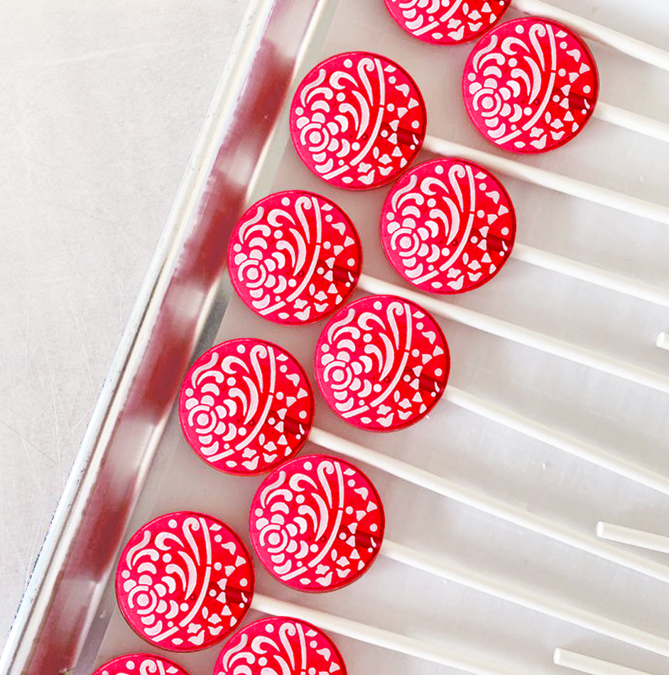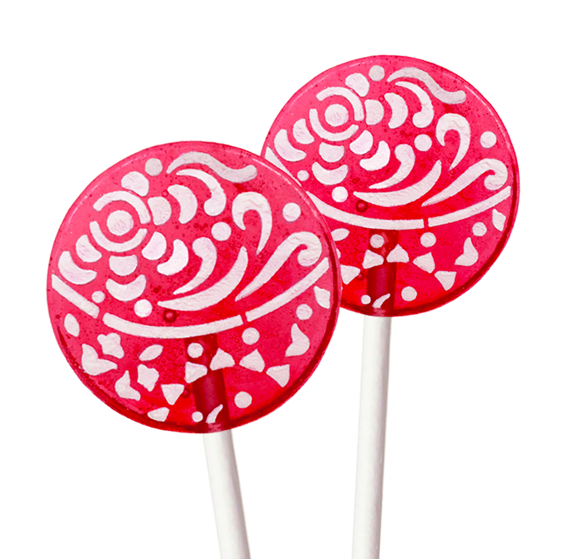 Popette of Pendulum’s Raspberry Lollipop Case includes 40 juicy delicious lollipops. Each lollipop has it’s own hand glazed candied vanilla design and measures 2″ in diameter and .375″ (3/8″) thick. Size: 1 oz (27g). Serving Size: 1, 80 Calories. Each Lollipop is individually wrapped.