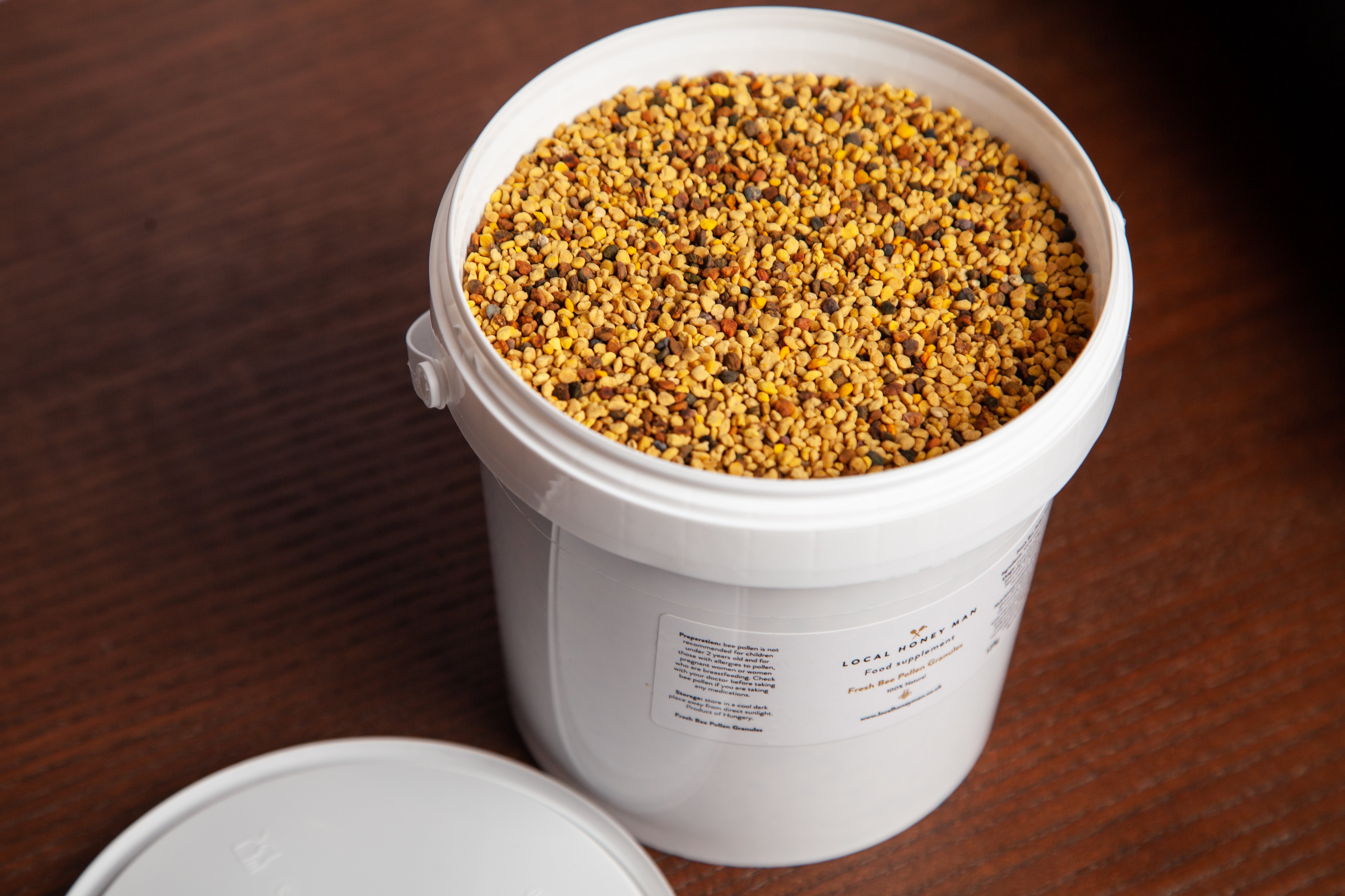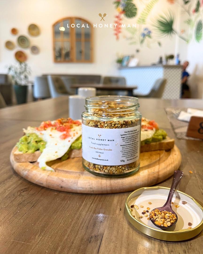 Bee pollen is a nutritious superfood believed to contain more protein than any other animal product. To be precise, this small but powerful substance has A, C, D, E, K and all the B’s plus amino acids, omega 3 oils, folic acid and antioxidants. You can sprinkle these bee grains over breakfast bowls, dessert or dinner. It’s extremely rich in carotenes and high in B-complex, vitamins and Lecithin. Boost your energy and vitality with our pure, raw bee pollen! This natural wonder is packed with nutrients and can be enjoyed in a variety of ways. How to Enjoy Bee Pollen Our favourite way to consume bee pollen is to mix a teaspoon into one of our delicious raw, or infused honeys – a perfect blend of sweetness to start your day. You can also: – Dilute it in warm water or hot tea- Sprinkle it on your breakfast cereal-Sprinkle over natural yogurt for gut health benefit-Sprinkle over Salads for an immune system boost- Eat it neat, from a spoon, just like any other food! Suggested Dosage – Adults: Start with ½ teaspoon about 30 minutes before your first meal of the day. Gradually increase your intake by a few grains per day over the course of a week until you reach a full teaspoon, 1-2 times per day (5-10 ml).- Children: Begin with 2-3 grains each morning, increasing by a grain per day until reaching ½ teaspoon. Tips: Listen to your body and adjust your dosage accordingly. Enjoy the natural goodness of bee pollen and experience the benefits for yourself!