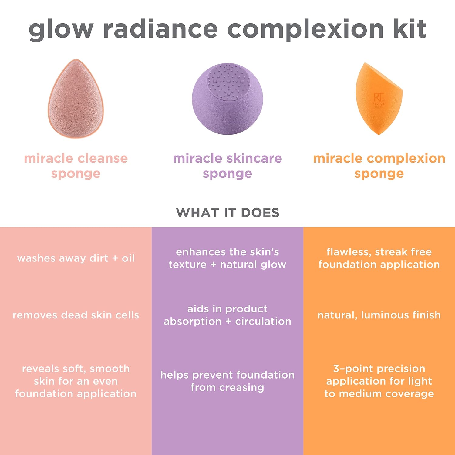 The Real Techniques Pro-Glow Radiance Complexion Kit covers all your needs for a glowing look! Turn these 3 sponges into your easy, everyday skincare and makeup routine. The Miracle Cleanse Sponge is infused with probiotics to help calm the skin while the Skincare Sponge is infused with vegan collagen to promote elasticity and firmness. Get the most of out of your routine! Miracle Cleanse Sponge pairs with a facial cleanser to remove impurities and polish pores resulting in soft, smooth skin for an even makeup application. Miracle Skincare Sponge has a multi-functional skin enhancer, tones the skin and enhances circulation to help prevent creasing for a smooth application. Pair with your favorite toners, serums, and moisturizers for deeper application. The Miracle Complexion Sponge is our #1 makeup sponge will provide flawless application for a natural luminous finish. Pair with any liquid foundation and use damp or dry.Directions of Use:Miracle Cleanse Sponge: Wet sponge. Apply cleanser, massage on face and rinse. Miracle Skincare Sponge: Wet sponge. Apply toner with sponge and skincare products with massager. Miracle Complexion Sponge: Use pointed tip to dot on concealer under eyes and over imperfections. Blend using patting and bouncing motions with the rounded side. Use the flat edge to contour around the eyes and nose building coverage where desired.Cleaning, Care, and Maintenance:Rinse through with lukewarm water after each use. Deep clean once per week with makeup sponge cleanser. Dab on a dot of your favorite makeup sponge cleanser. Add water and gently squeeze to lather. Rinse the sponge with water. Air dry thoroughly in a well-ventilated area. Store in a cool, dry place. Ensure to replace your sponge every 30 uses.