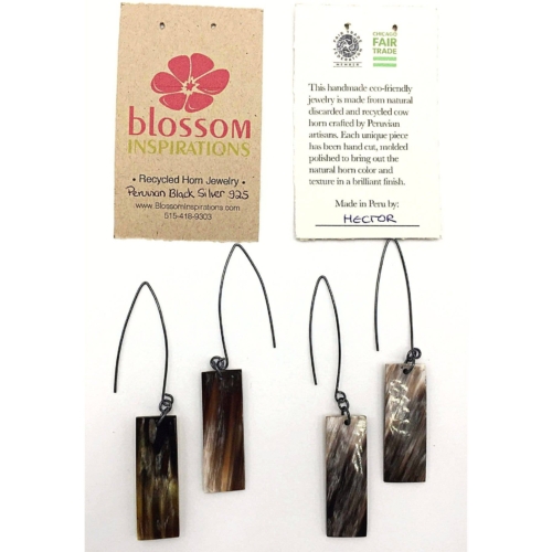 Rectangle horn earrings with Peruvian silver 925. This handmade jewelry is made from natural discarded and recycled cow horn with Peruvian sterling silver 925 crafted by Peruvian artisans. Each unique piece has been hand cut, molded and polished to bring out the natural horn color and texture in a brilliant finish. The metal back is sterling silver in black to get a rustic style.
