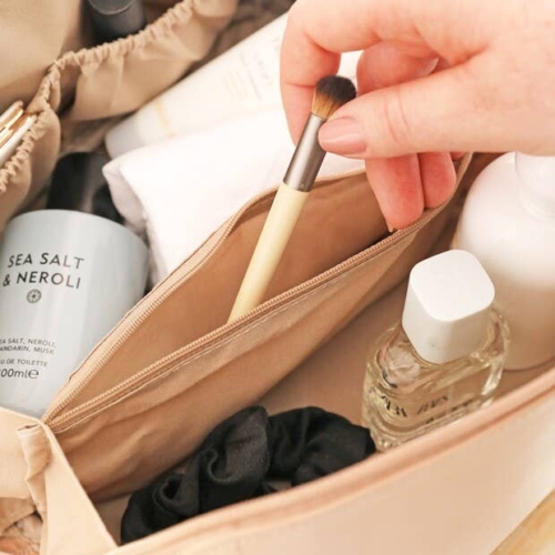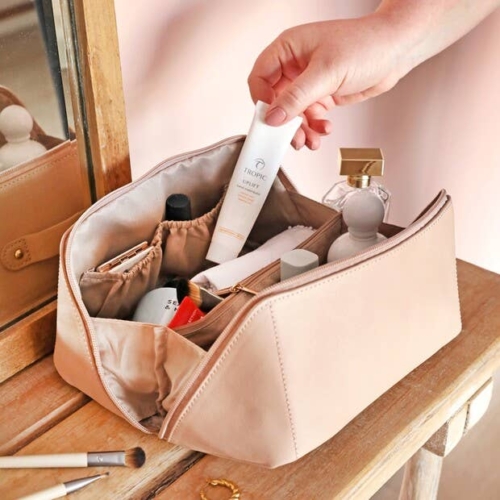Made of pink PU, this bag comes in a rectangular shape complete with a zip going diagonally across the centre. The zip opens up to reveal a zipped pocket in the centre with two elasticated sections on each side. A great way to store your makeup day-to-day, this case can also be used for travelling.Dimensionswidth 13cm x length 24cmMade fromPU, fabric, metal