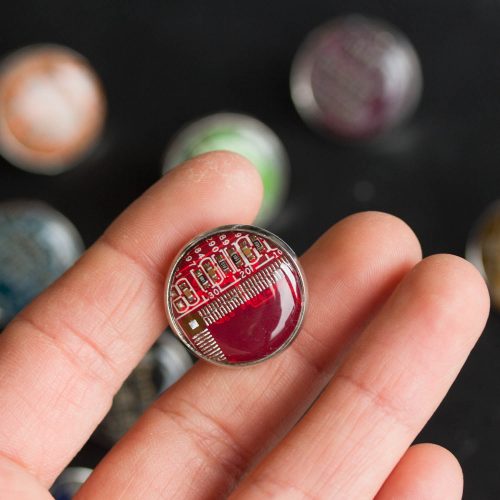 A little 18mm pin made with a piece of real circuit board. Excellent geeky, modern and techie accessory to show off your uniqueness every day, everywhere.