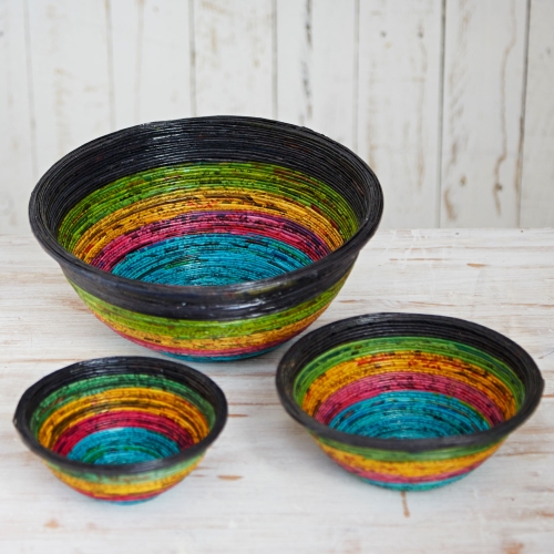 Our unique, handmade bowls have a bright striped design, crafted from recycled newspaper by Fair Trade artisans. A real statement piece, they’re a perfect new home gift for colourful characters._x000D__x000D_Dimensions:_x000D_Large – Diameter 28cm x Height 14cm_x000D__x000D_Our recycled newspaper products are exactly that – made from 100% recycled newspaper, hand-rolled, painted, and crafted into something beautiful._x000D__x000D_Due to the handmade nature of our products the colours and designs may vary, but loveliness comes as standard._x000D__x000D_Our bestselling, brilliantly colourful newspaper range is handmade by our supplier Earthbound Creations. The social enterprise based in Sri Lanka aim to minimise the environmental damage caused by the overuse and unsustainability of plastics, using only eco-friendly recycled paper to create stunning gifts. Committed to helping their community, they’ve helped over 250 families, and have reduced the migration of women as labourers into towns and overseas. By employing homeworking artisans, they allow mothers, those with disabilities, and the elderly to provide for themselves and their families._x000D__x000D_By making a purchase, you are helping to continue the fantastic work of our producers._x000D_