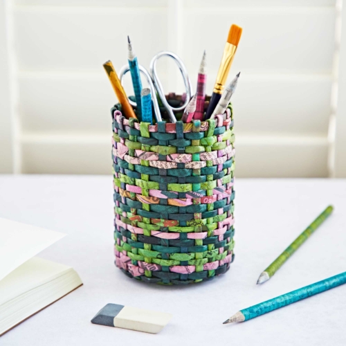 Brighten up your desk with our colourful round pencil holders. Hand crafted from recycled newspaper, each piece is rolled, painted, and woven by Fair Trade artisans. For even more eco-friendly points, why not pop some of our recycled newspaper pencils in your pot._x000D__x000D_Dimensions: Approx Diameter 9cm, Height 12cm_x000D__x000D_Our recycled newspaper products are exactly that – made from 100% recycled newspaper, hand-rolled, painted, and crafted into something beautiful._x000D__x000D_Due to the handmade nature of our products the colours and designs may vary, but loveliness comes as standard._x000D__x000D_Our bestselling, brilliantly colourful newspaper range is handmade by our supplier Earthbound Creations. The social enterprise based in Sri Lanka aim to minimise the environmental damage caused by the overuse and unsustainability of plastics, using only eco-friendly recycled paper to create stunning gifts. Committed to helping their community, they’ve helped over 250 families, and have reduced the migration of women as labourers into towns and overseas. By employing homeworking artisans, they allow mothers, those with disabilities, and the elderly to provide for themselves and their families._x000D__x000D_By making a purchase, you are helping to continue the fantastic work of our producers._x000D_