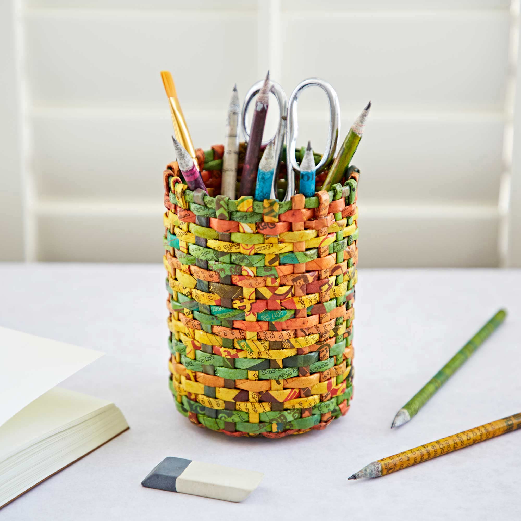 Recycled Newspaper Round Pencil Holder in orange yellow and green