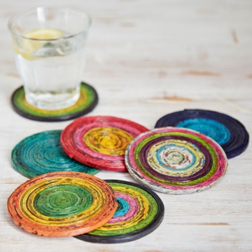 Add a splash of colour to your décor with our quirky coasters. Handmade from recycled newspaper in a vibrant striped design, they make a great new home gift for planet-friendly pals._x000D__x000D_Dimensions: Diameter 10cm (Holder – 11x4cm)_x000D__x000D_Our recycled newspaper products are exactly that – made from 100% recycled newspaper, hand-rolled, painted, and crafted into something beautiful._x000D__x000D_Due to the handmade nature of our products the colours and designs may vary, but loveliness comes as standard._x000D__x000D_Our bestselling, brilliantly colourful newspaper range is handmade by our supplier Earthbound Creations. The social enterprise based in Sri Lanka aim to minimise the environmental damage caused by the overuse and unsustainability of plastics, using only eco-friendly recycled paper to create stunning gifts. Committed to helping their community, they’ve helped over 250 families, and have reduced the migration of women as labourers into towns and overseas. By employing homeworking artisans, they allow mothers, those with disabilities, and the elderly to provide for themselves and their families._x000D__x000D_By making a purchase, you are helping to continue the fantastic work of our producers._x000D_