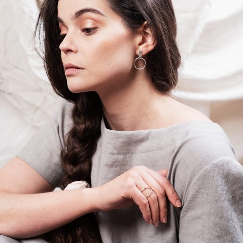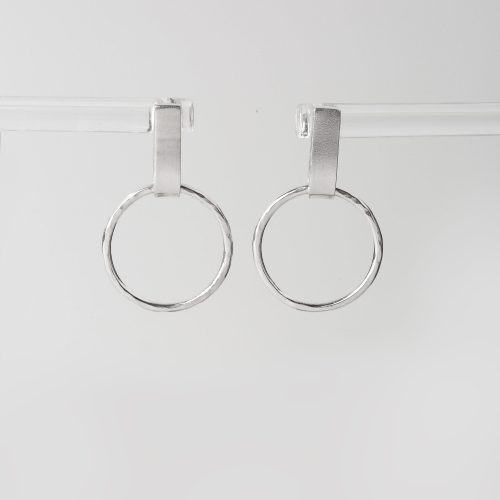 Contemporary pair of statement stud earrings handmade from scratch to order using high quality recycled eco silver. Open circles finished with a gentle hammered effect attached through a contrasting high polish loop with a stud post back. These lightweight striking earrings go with everything and are perfect for every occasion.