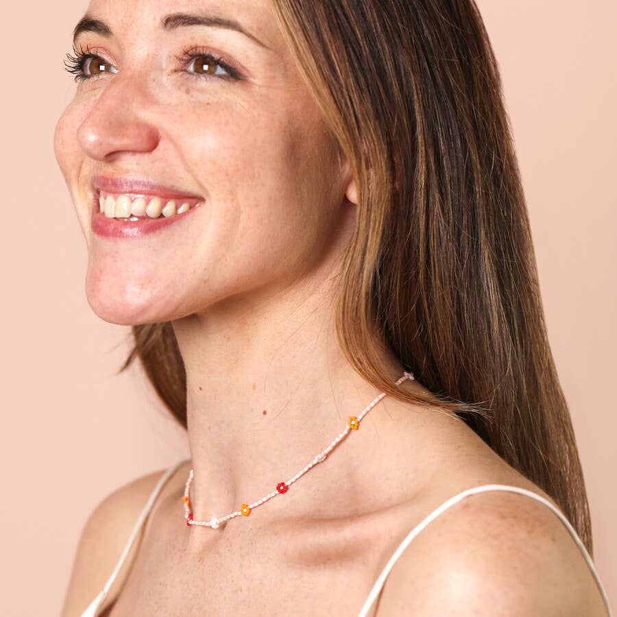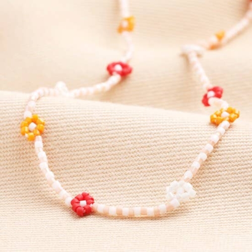 A floral beaded necklaceFeaturing red, orange and clear daisiesWith alternating peach and white beadsPerfect for spring themed jewellery collectionsDimensions: length 40.5cm (16″) with a 5cm extenderMade from: glass, nylon