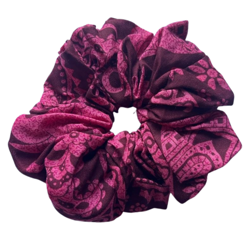 Red Pink Elephant Tusker Hair Scrunchie Ties We try not to waste anything in the factory, so any left over fabric from a reel is now made into these cute Hair Ties / Hair scrunchies. Each one is made from the same great Rayon fabrics that our Spring Summer pants are made from – The ponytail holder has an elasticated core and can be stretched with the outer diameter measuring approx 7 inches – so a generous sizing. Match with the harem pants of the same design for a cute combo.