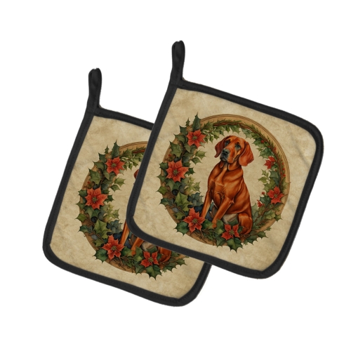 Red Redbone Coonhound Christmas Flowers Pair of Pot Holders