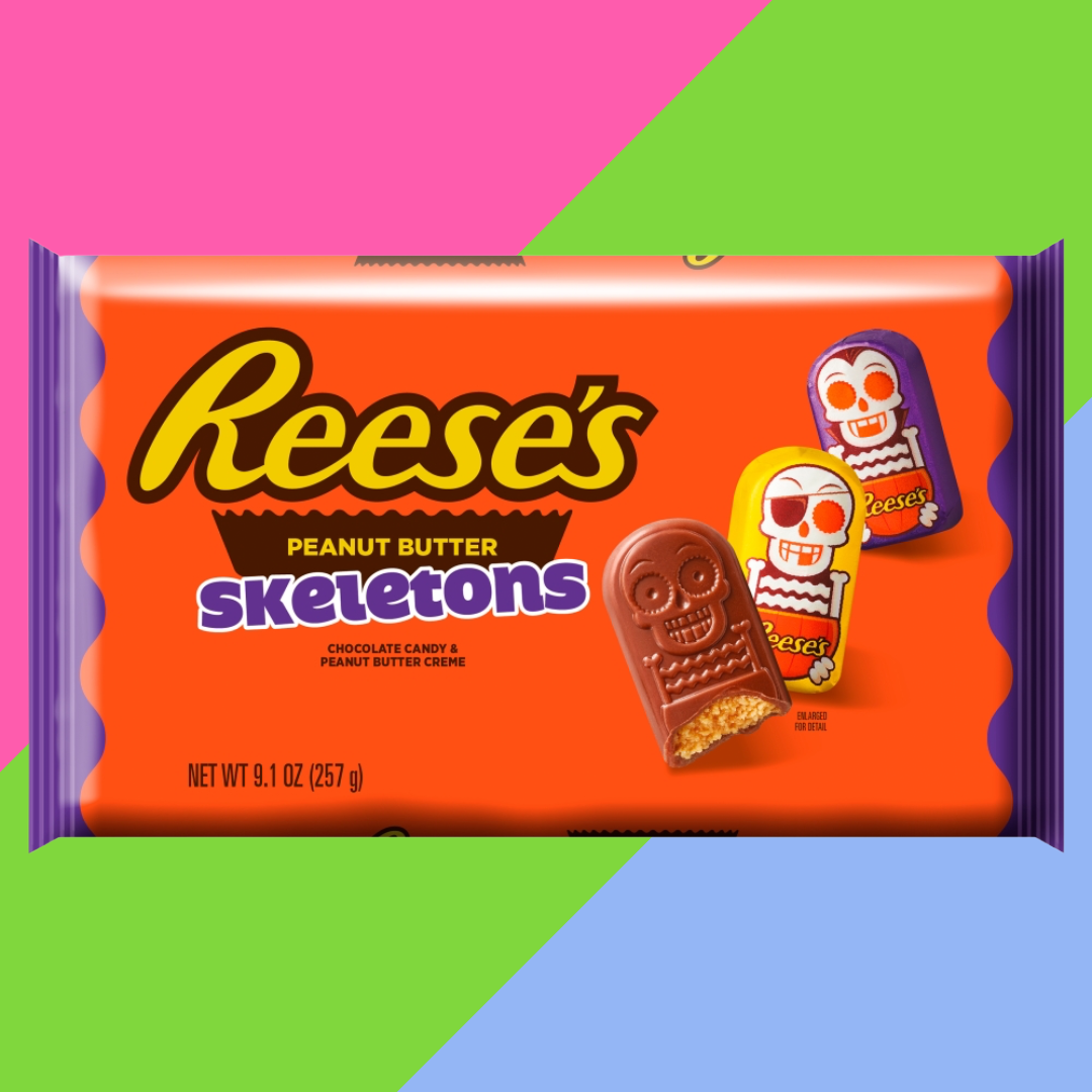 Milk chocolate and white skeleton-shaped miniature cups with a peanut butter crème filling A skele-ton of fun Perfect for Halloween Reese’s Peanut Butter Skeletons are a skele-ton of fun! Each pack contains skeleton-shaped milk and white chocolate cups filled with Reese’s classic peanut butter crème, individually wrapped in spooky skeleton foil. They’re the perfect chocolate treat for both customers and trick-or-treaters. Be sure to display these spooky skeletons in a prominent spot within your Halloween range.