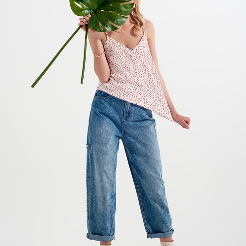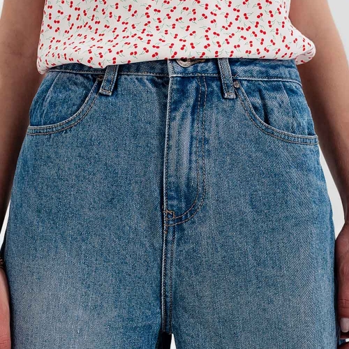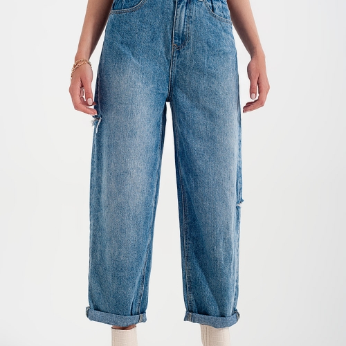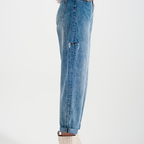 High rise relaxed fit jeans with ripped details including belt loops four pockets and fly front zipper