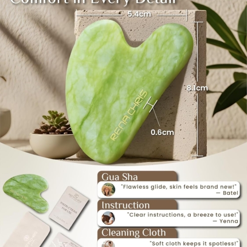 NATURAL STONE: Rena Chris gua sha stone is handcrafted from 100% Xiuyan Jade from northeast of China. Xiuyan Jade symbolizes power and immorality in Chinese history