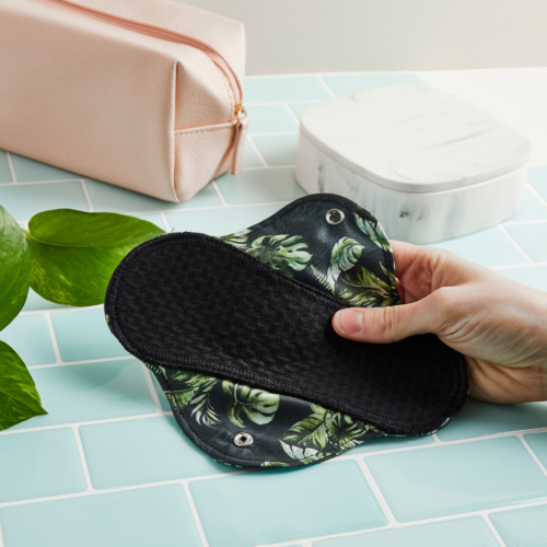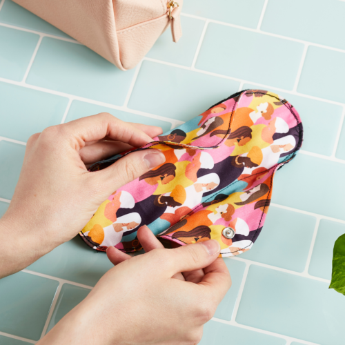 Reusable Menstrual pads made with cotton and Zorb®, a lightweight blend of organic cotton and polyester with a hidden waterproof layer of 2-mil polyurethane film laminated in between.