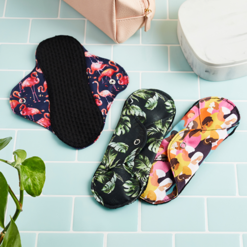 Reusable Menstrual pads made with cotton and Zorb®, a lightweight blend of organic cotton and polyester with a hidden waterproof layer of 2-mil polyurethane film laminated in between.