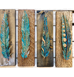 Cold oxidized mounted feathers on various wood boards in shades of Jade. Every design is unique. Sealed for lasting beauty.