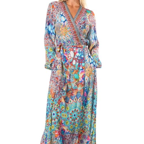 Women’s Maxi Wrap Dresses by La Moda Sea Escape Women’s Maxi Wrap Dresses by La Moda. A plunging V neckline takes this design from sweet to sultry, Fitting for brunch at a luxurious beach front resort, this stunning wrap dress is so easy to wear and be comfy yet look elegant. This flowy look is easy to pair with a staple sandal in the warmer months or a bold boot in the colder, this cool and classic dress is sure to be your go-to from season to season. 100% Viscose Silk Pack of 4 Pcs This is a unique garment. The imperfections in these fabrics are not considered defects, but characteristics that make them authentic.
