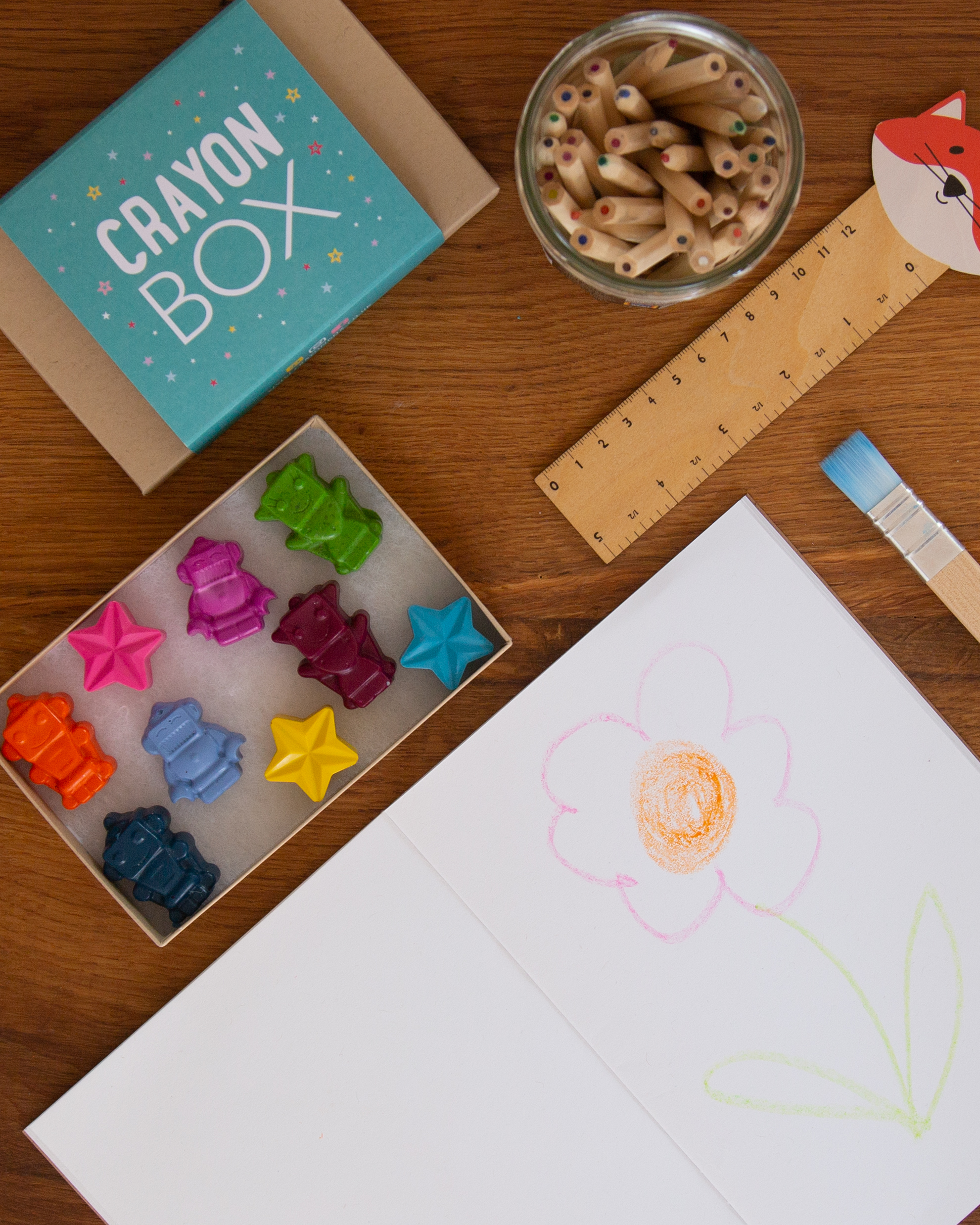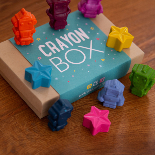 Encourage children to draw and learn with a set of 6 ‘robot shape’ wax crayons. Presented in a 100% recycled, and recyclable kraft card gift box tied up with beautiful bright ribbon these little figures are the perfect gift.