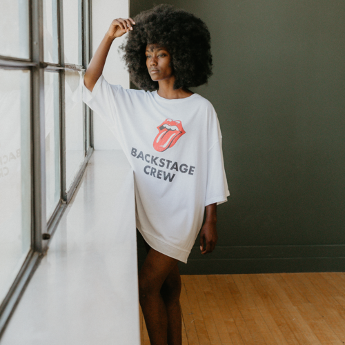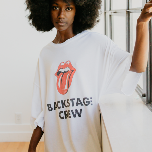 A must have for all rock ‘n’ roll fans, our Rolling Stones Backstage Crew Oversized Tee showcases the band’s iconic logo and a handwritten set list on the back. Crafted with a premium blend of Modal and Organic Cotton and cut oversized, it is flattering on all body types. Rock it as a dress or over your favorite pair of jeans for a more relaxed look. + White+ One Size+ Machine wash cold / warm+ Tumble dry on low 50% Modal / 50% Organic CottonEthically made in Los Angeles, CA