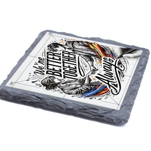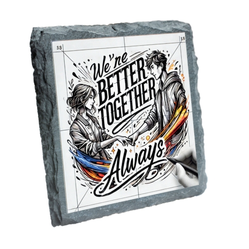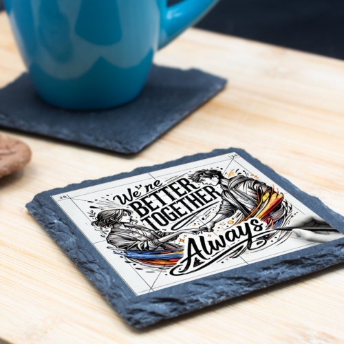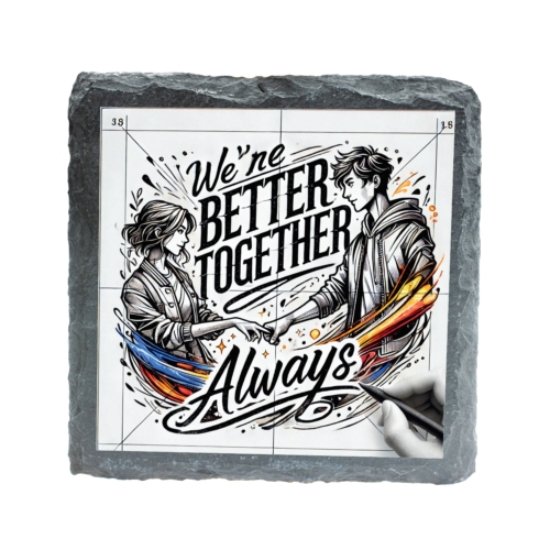 Enhance your home with the Romantic Slate Coaster Set, featuring the heartfelt message ‘We’re Better Together Always’. Crafted from durable natural slate, these coasters offer a rustic charm while protecting your surfaces from scratches and moisture. The intricate illustration, showcasing a touching connection between two figures, is both eye-catching and meaningful. Ideal for couples, these coasters make a perfect gift for anniversaries, weddings, or any special occasion. Easy to clean and versatile, they add a personal touch to any decor.