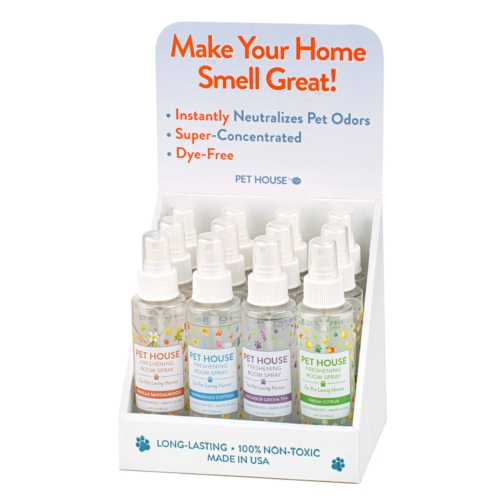 Displays come with 3 each of Lavender Green Tea, Fresh Citrus, Sunwashed Cotton, and Vanilla Sandalwood. These are 4oz spray bottles. ***One Fur All Products may not be sold on Amazon, eBay or other 3rd party websites.Get rid of odors and freshen your home with a Pet House Freshening Room Spray from One Fur All! Designed and formulated to neutralize odors, they are a must-have for both dog and cat owners. While most sprays simply mask smells, our blend includes an odor neutralizer that leaves your home clean, welcoming, and undeniably fresh.Using top-quality long-lasting fragrances, we developed scents that will fill the room with a calming aroma thats never overwhelming! Our freshening room sprays contain no paraffin, dyes, parabens, phthalates, and formaldehyde.At One Fur All, we know that a happy, healthy home starts with a clean environment.