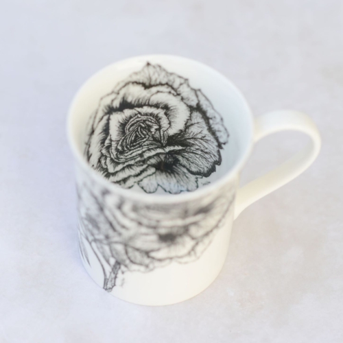 An exquisite fine bone china mug adorned with original fine line drawings of beautiful Rose & Jasmine.