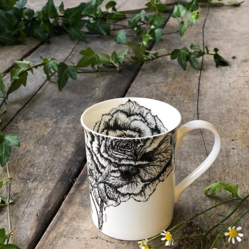 An exquisite fine bone china mug adorned with original fine line drawings of beautiful Rose & Jasmine.