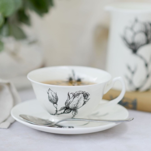 Whether your tipple is Earl Grey or a sneaky gin and tonic, this decadent cup is the perfect indulgence! Delicately adorned with beautiful rose and jasmine fine line drawings.