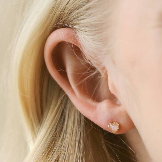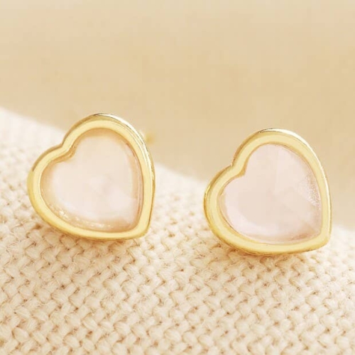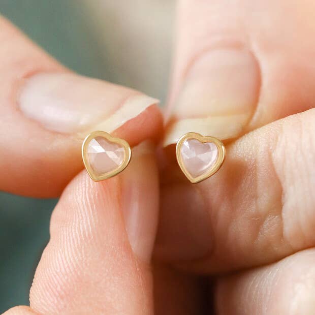 Heart-shaped rose quartz is encased in 14ct gold plated brass with a stunning faceted face to give these earrings a touch of elegance.Their hypoallergenic sterling silver posts mean they’re great for sensitive skin.Fasten these studs via their butterfly backs and enjoy the lightweight feel of these timeless pink pieces!Dimensionswidth 5mm x height 5mm x depth 4mmMade from14ct gold plated brass, rose quartz, sterling silver posts