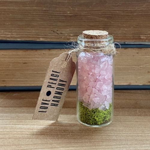 Rose Quartz crystals rest on a bed of reindeer moss in a glass vile with a cork closure.