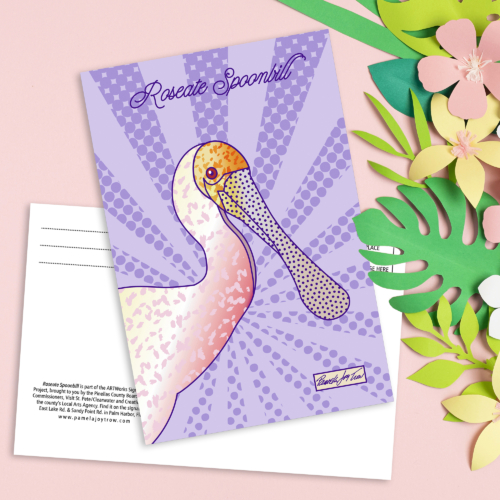 This is a beautiful Roseate Spoonbill on a 4×6 postcard. The art is part of “Birds of a Feather”, a four-panel vinyl wrap ARTworks Signal Box project. The signal box is located in Palm Harbor, Florida, USA.