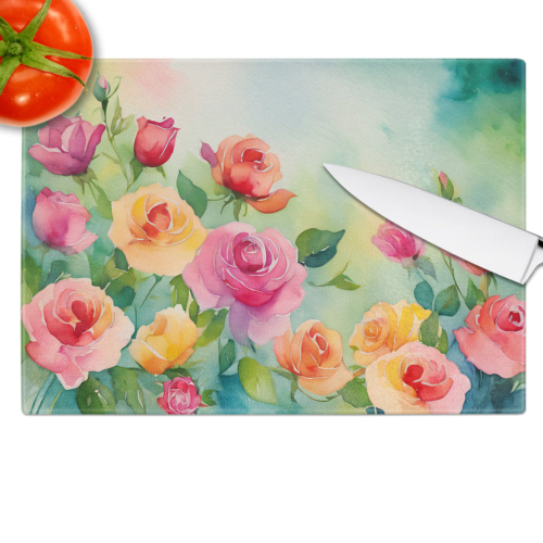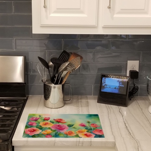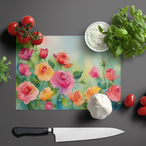 Glass Cutting Board featuring breed specific Roses artwork. Introduce your kitchen to the vibrant, large Decorative Glass Cutting Board from Caroline’s Treasures. Crafted from resilient tempered glass, this board is not only a utilitarian necessity but also a colorful art piece. With its generous dimensions of 15 inches in height and 12 inches in length, it offers ample space for all your cutting needs. Every piece showcases captivating artwork from distinguished artists, bringing an aesthetic edge to your kitchen. Beyond its attractive design, this cutting board ensures your countertop stays pristine and unscathed, owing to its heat-resistant properties. Engineered with user convenience in mind, it features non-skid feet for stability, and rounded corners for additional safety. Its robust construction renders it virtually unbreakable, guaranteeing longevity. The board comes with protective feet bumpers, maintaining its position during use. This product is recommended to be hand washed only. Proudly printed and assembled in the United States, this cutting board exemplifies superior craftsmanship. With Caroline’s Treasures’ Decorative Glass Cutting Board, you’re investing in a blend of functionality and artistic flair.