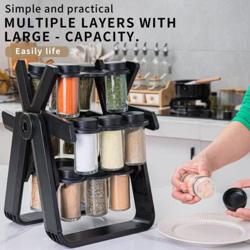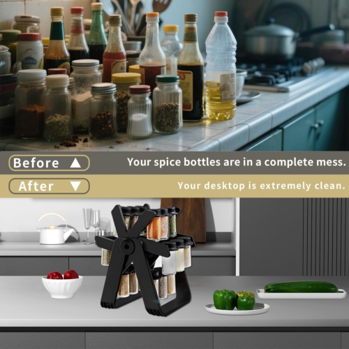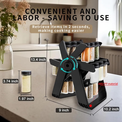INNOVATIVE DESIGN: Ferris wheel style rotating spice rack measures 10.2″x9″x13.4″, featuring an elegant design that adds style while maximizing counter space organizationSTORAGE CAPACITY: Includes 18 glass jars of 100ml (3.74″x1.97″) each, perfect for storing various spices and seasonings with easy-access dispensing holesORGANIZATION SYSTEM: Comes with pre-made spice label stickers for clear identification and organized storage of your favorite seasoningsSTURDY CONSTRUCTION: Robust build ensures stability on countertops with secure jar attachments for reliable daily use in your kitchenQUICK ASSEMBLY: Simple 10-minute setup process with included instructions and assembly tools for hassle-free installation