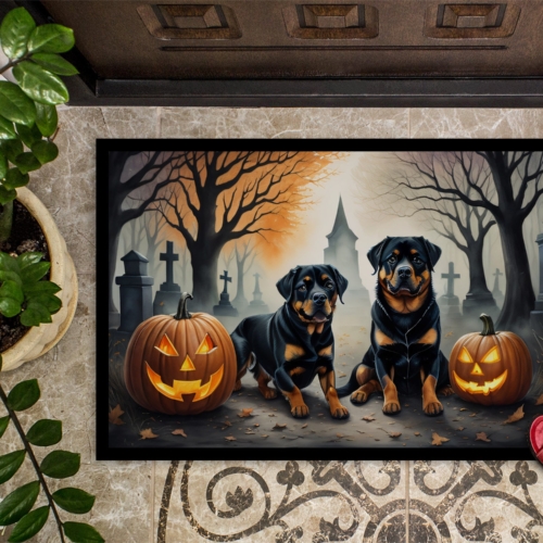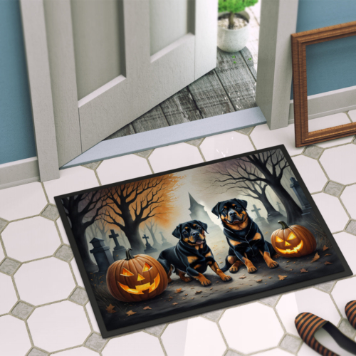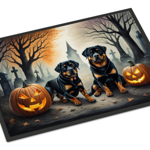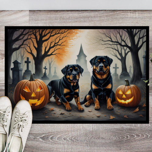 Doormat featuring breed specific Rottweiler artwork. Celebrate Halloween with this Halloween Doormat. Welcome your guests in style with our Artwork Door Mat, designed to withstand almost any weather condition. This mat, measuring approximately 18 by 27 inches, is held together by durable black binding tape. Its top layer, composed of polyester felt, is dyed with the eye-catching image you see on the mat. A few layers below provide the mat with stability, while its rubber bottom is stamped to help prevent slipping and ensures safety. Our mat works wonderfully as both an indoor or outdoor door mat. For cleaning, simply hose it off with water or use a power washer – no need for any cleaner that produces suds. Avoid scrubbing with a brush, instead, opt for the vacuum on floor setting. Designed manufactured and printed in the USA, this mat is a perfect addition to your porch, outdoor kitchen, entryway, or any indoor space. Its unique design makes it a charming decorative rug that greets your guests and adds a stylish touch to your home decor.