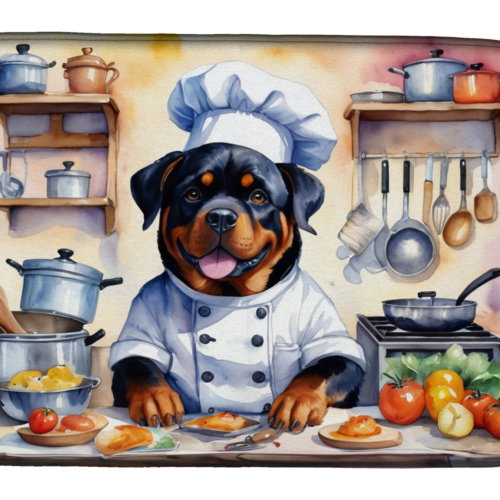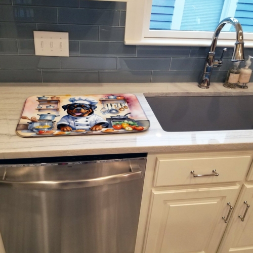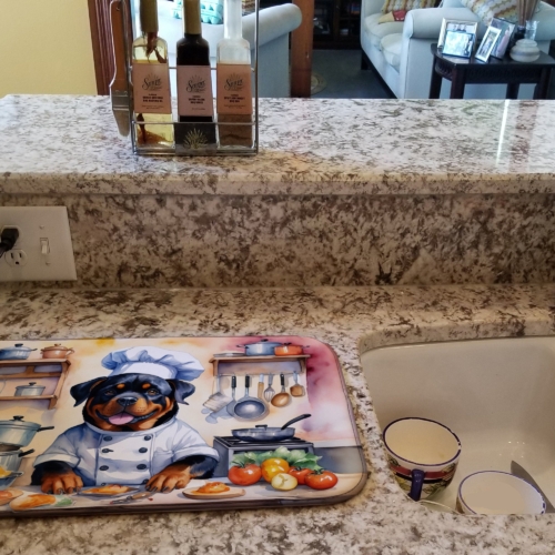 Dish Drying Mat featuring breed specific Rottweiler artwork. Say goodbye to messy countertops and soggy dish towels with our innovative dish drying mat. Our high-quality dish drying pad is designed to keep your countertops dry while offering a stylish and efficient solution. Whether you’re air drying dishes, glasses, stemware, silverware, pots, pans, bottles, or even fruits and vegetables, our dish mat is the perfect choice. The 14 inches x 22 inches size fits most counters and dish drying racks, and the non-slip design ensures stability. Made with water-absorbent polyester and a polyurethane foam insert, our dish drying mat is not only functional but also durable. It’s machine washable and printed in the USA for long-lasting use. The beautiful artwork adds flair to your kitchen decor, making it a perfect housewarming gift or present for any occasion. Upgrade your kitchen experience with our absorbent and versatile dish drying mat.