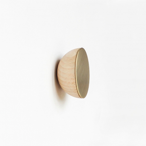 Minimalist geometric style round beech wood wall mounted coat hook with a golden coloured brushed brass front finish. Combine with different styles from the hooks collection for a playful effect on your wall and add your own personal style to your interior.