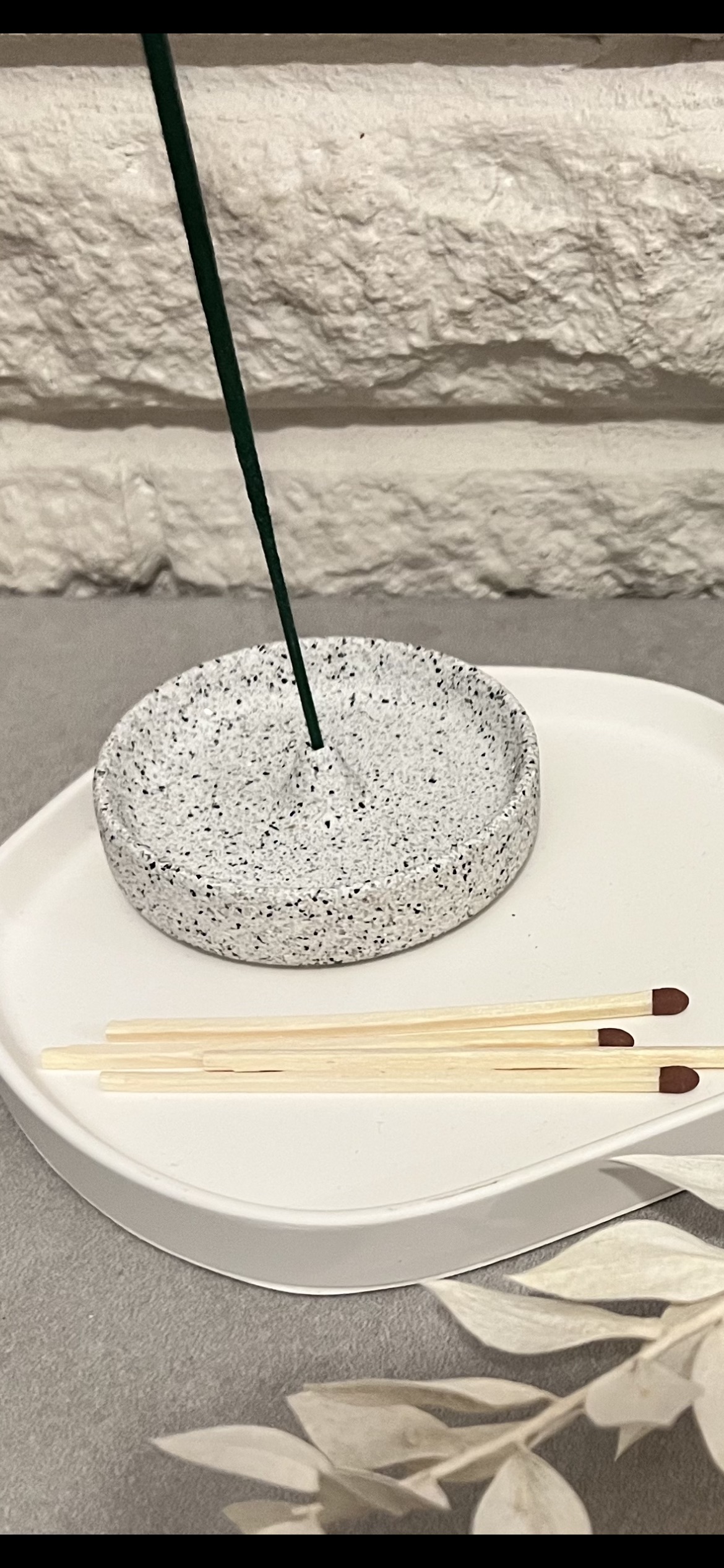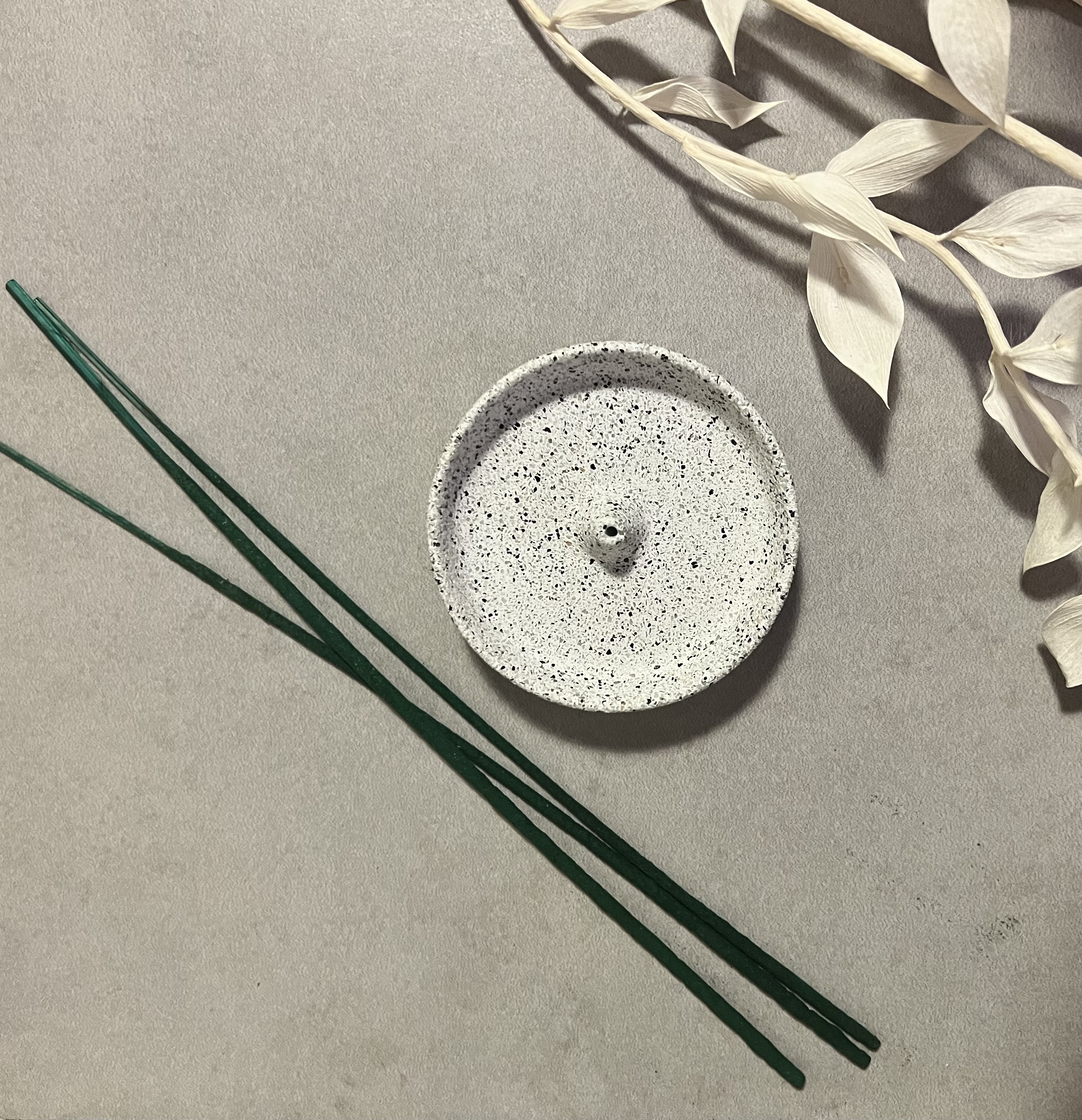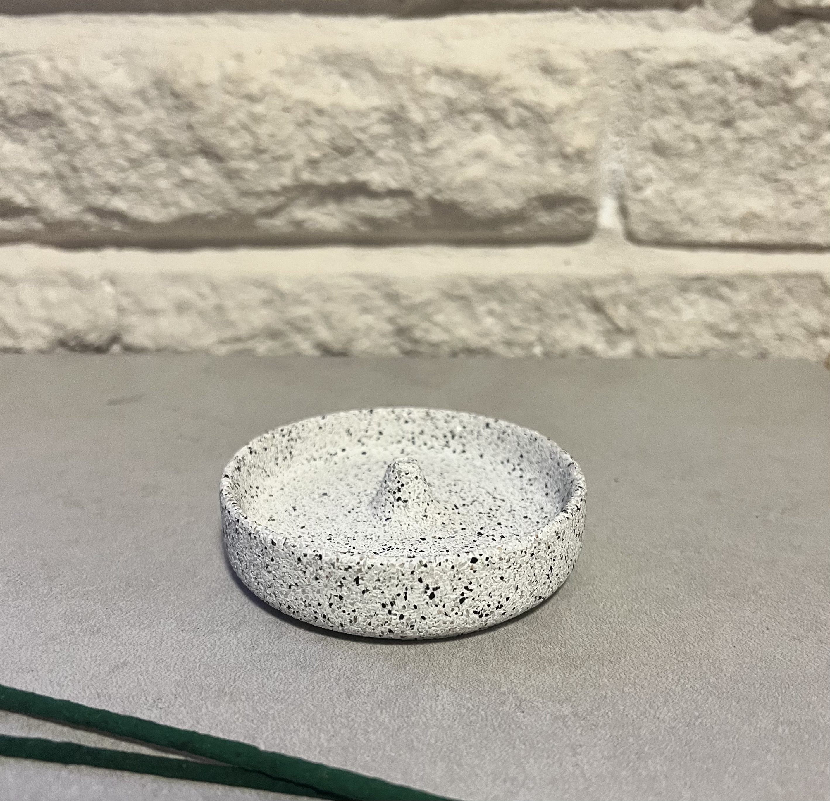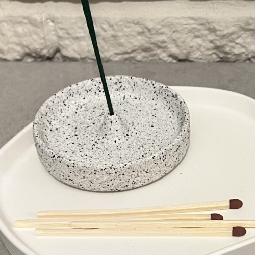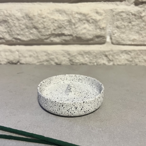 Round granite-style jesmonite incense holder with bowl/lip