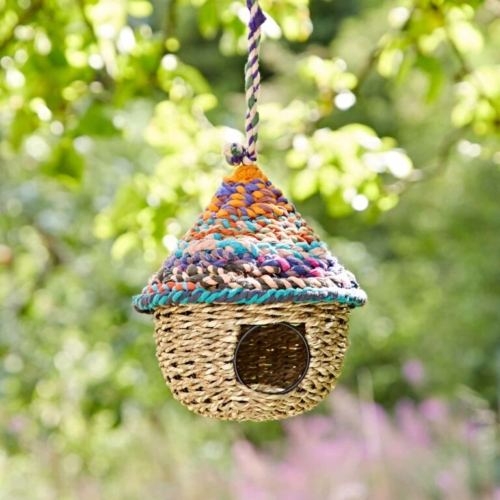 Our handcrafted bird house makes a charming addition to your outdoor area. It adds a vibrant touch to your garden and is perfect to welcome little birds or to display as a unique decoration. This nester is skilfully crafted by Fair Trade artisans in India using recycled metal, cotton and munja. Munja is a tough grass (saccharum munja) with great natural water-repellent abilities, and has been sustainably sourced from across India. Each nest box is a different mix of colours, making each one unique. Dimensions below exclude hanging cord. 18 × 18 × 20 cm This is a medium-sized bird nester from our birdhouse range. Made from recycled metal, cotton and munja, this sustainable nester can be hung with its long loop attachment. Every birdhouse is unique and has a different mix of colours, but we know you’ll love what you’ll get! Position these in ivy, bushes, hedges or trees to give birds somewhere cosy to shelter. During the breeding season, locate the nester in thick cover to help reduce the risk of predation. Please note that each product is unique and possesses distinct traits as a result of its handmade nature. You can be confident that we would never send you an item that we didn’t believe you would love.